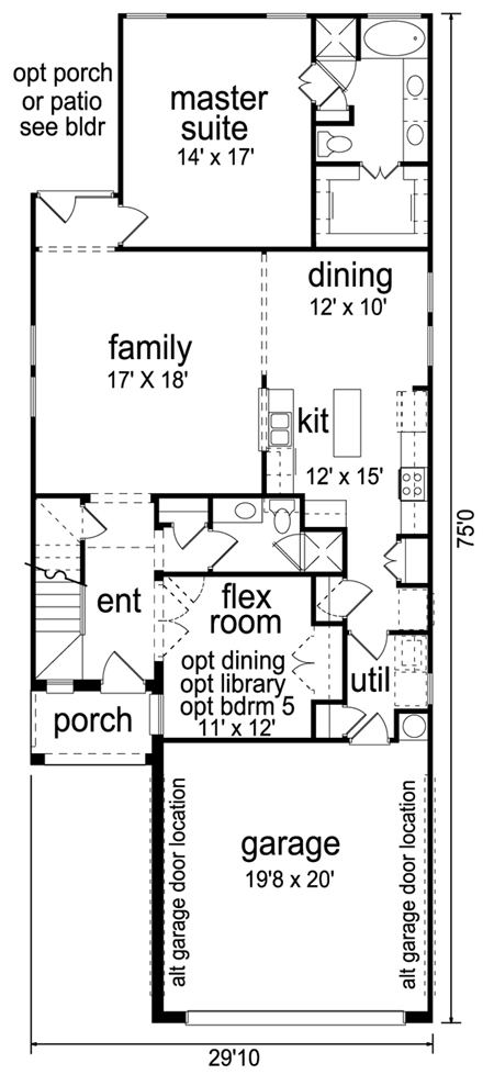 | Description: Perfect for a growing family, this narrow plan has the master suite downstairs with a generous bath. Large kitchen services the equally large family room. Flex room can be a 5th bedroom or study. Gameroom in convenient to both bedrooms upstairs. |