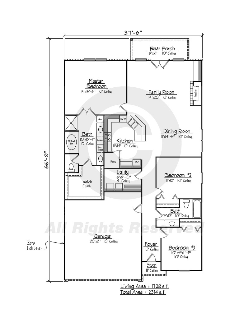 Description: A Louisiana Garden style Zero Lot home plan that has a good layout. The home plan features three bedrooms with the lesser rooms being at the front of the home and the master isolated toward the back and on the opposite side. In the master you will find plenty of room in the 14’ x over 16’ space. Your master bath is well sized and gives way to your spacious master walk in closet. In the main living area you will find everything to be open making the space seem larger then what it is. The kitchen overlooks the family room and dining room. Your family room has a homey fireplace with built in around it and French doors that open to you rear covered porch. Lastly the house has a forward facing 2 car garage that you will find easy to get your cars in and out of. The Camdon Louisiana Garden style zero lot line house plan is a good choice for your next home.