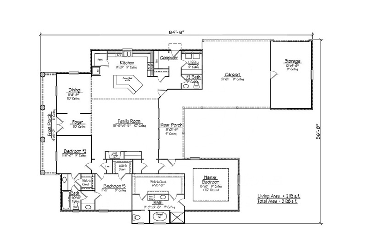 Description: The LA Purchase is one of our Louisiana Acadian home plans that is a great family home. This is an open house plan that makes it great for entertainment. The kitchen is large 14’ x 19’ with a large convenient center island. You will also find the computer room in this modern age a great addition to this home. The master bedroom features a stunning recessed ceiling and a large walk in closet. You will find the other two bedrooms of good size and with “Jack and Jill” bathroom access and separate vanities. For your cars there is a 2 car carport with a large enclosed storage area that could be used for a boat or another car. You will love to live in this Louisiana Acadian style home.