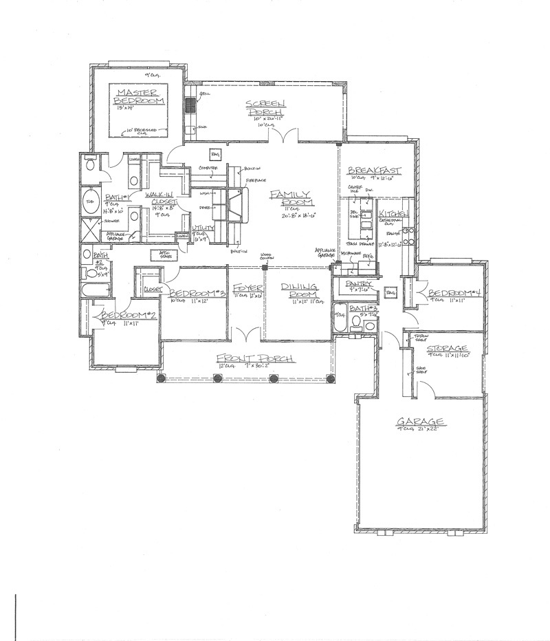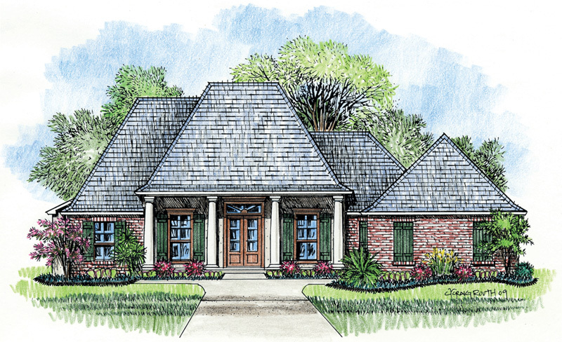 Description: Like columns the Orleans Louisiana Country French is adorned with four columns framing the front door and front windows. Inside the home you enter into your foyer with the dining room to your right and the large family room in front of you. The family room has a large fireplace with built-ins on either side. The kitchen is open to the family room with a great large island with a cathedral ceiling. Your 2 car garage has a large storage area that could be used as a shop or another room with some creative thinking. The forth bedroom is just inside the garage with access to a full bath. On the opposite side of the house you will find two other bedrooms that share a bath and the master. The master suite has a 10’ recessed ceiling with large windows that overlook the back of your property. In the master bath you will find his and her vanities with a separate shower and whirlpool or garden tub. Also the walk-in closet is accessed through the bath which leads to the utility room which means no more dirty clothes left on the closet floor. Modern convenience is also built in with a computer desk in the hall way to the master bedroom. Out back you will discover your 10’ by almost 27’ screened porch to keep your outdoor parties bug free. Also outback you will enjoy your outdoor kitchen with sink and prep area great for the grill master of the family. We hope you find the Orleans Louisiana house plan to your liking and remember if you want any changes we can do that too.