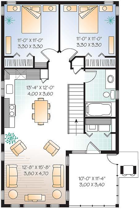 2nd Level: Family room, eat-in kitchen, 2 bedrooms, bathroom, laundry area.