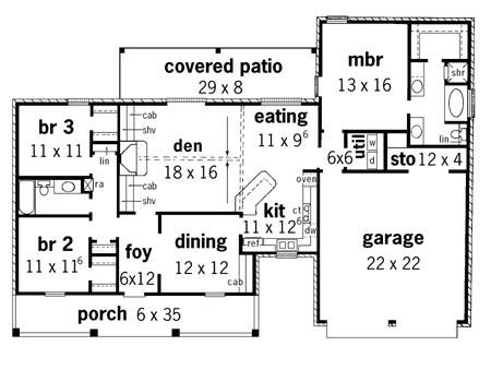 | Description: This traditional country styling of this home is most appealing with the covered front and rear porches and its split bedroom layout. This plan features a vaulted ceiling and fireplace flanked by cabinets and bookshelves which is open to the breakfast area and kitchen with an angled eating bar. The secluded master suite offers a private bath with whirlpool tub , separate shower, and walk-in closet.
