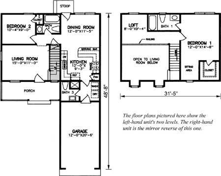 | Description: 2 story duplex, 2 bedrooms, 2 1/2 baths each, formal living room w/vaulted ceiling, kitchen/dining serving bar, W/D nook, front porch, back stoop, 1-car attached garage |