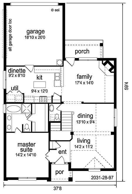 | Description: Room for a growing family! This rear entry garage plan has an impressive living/dining area w/vaulted ceiling & plant ledge. Large kitchen houses an island, pantry & utility closet. 3 bedrooms share a large bath upstairs. Stylish brick elevation features shutters & arched windows.