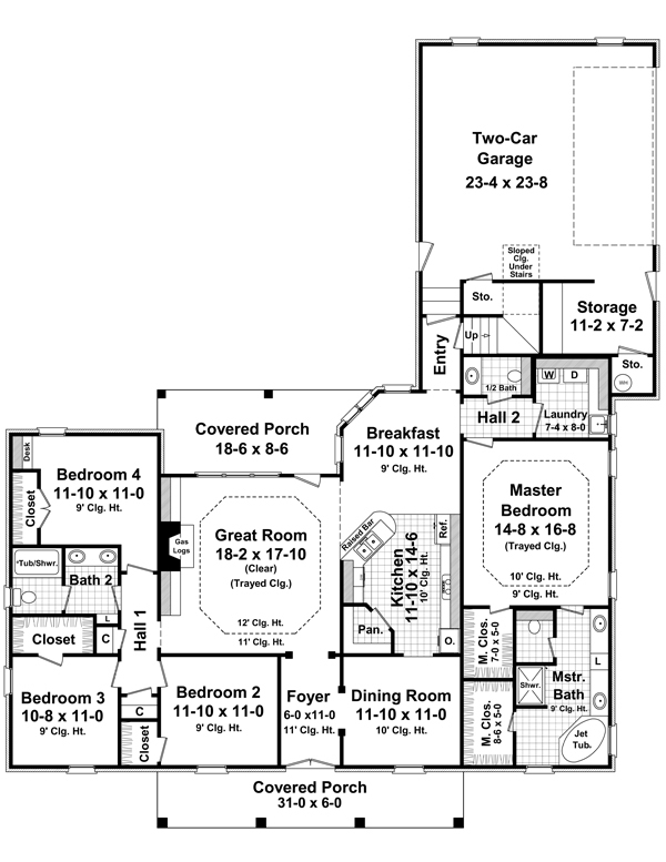 Description: This well-designed plan provides many amenities that you would expect to find in a much larger home. The master suite features a wonderful bathroom with large walk-in closets. The great room has gas logs as well as built-in cabinets and 12' trayed ceilings that make it a great place to relax and spend time with family and friends. The rear covered porch provides a great space for those summer cookouts as well as being close to the kitchen. A dining room and breakfast area are provided for formal or informal meals. The always popular bonus room provides an excellent space for storage or future expansion. The two car garage features space for real-sized vehicles. This plan is the perfect solution to your family's needs.
