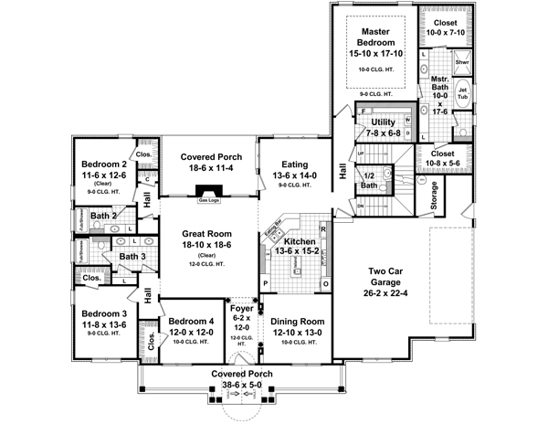 Description: This traditional country home includes an open floor plan with 4 spacious bedrooms, 3 1/2 baths, a split-bedroom layout, and other unique features. The master suite includes a raised ceiling in the master bedroom, 2 large his and her walk-in closets, a jet tub, and an oversized shower. The kitchen is fully-equipped with a wraparound raised bar, pantry, and a large adjoining breakfast area. Just off of the kitchen is a beautiful formal dining room complete with built-in shelves and 10' ceilings. One bedroom can even be used as a family member suite. Expansive great room features 12' ceilings, a gas log fireplace, and great views to the rear porch beyond. Large front and rear covered porches complement the livability of this home. This plan even features a large bonus room area perfect for storage or future expansion. An oversized garage is also provided for real-sized vehicles. Room spaces are designed large enough to have added space for a comfortable lifestyle! |