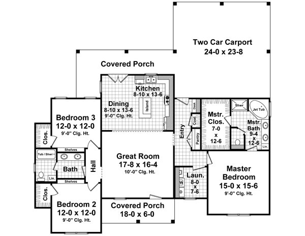 Description: This well-designed plan provides many amenities that you would expect to find in a much larger home. The master suite features a wonderful bathroom with large walk-in closet. The spacious great room includes great views to the rear as well as 10' ceilings which make it a great place to relax and spend time with family and friends. The rear covered porch provides a great space for those summer cookouts as well as providing close access to the kitchen. Two other bedrooms share a bath complete with plenty of storage for linens. There is also a two car carport with space for real-sized vehicles. This plan is the perfect solution to your family's needs. |