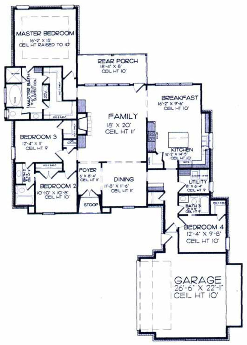 Description: 4 Bedroom, 3 Bath Master Bedroom: 16' 2" x 15' Bedroom 2: 10' 10" x 10' 8" Bedroom 3: 12' 4" x 11' Bedroom 4: 12' 4" x 9' 8" Family: 18' x 20' Kitchen: 16' 2" x 14' 5" Dining: 11' 8" x 11' 6" Breakfast: 16' 2" x 9' 6" Overall Dimensions:88' 6"x62' 4" Living Area: 2293 sq. ft. Total Area: 3102 sq. ft.